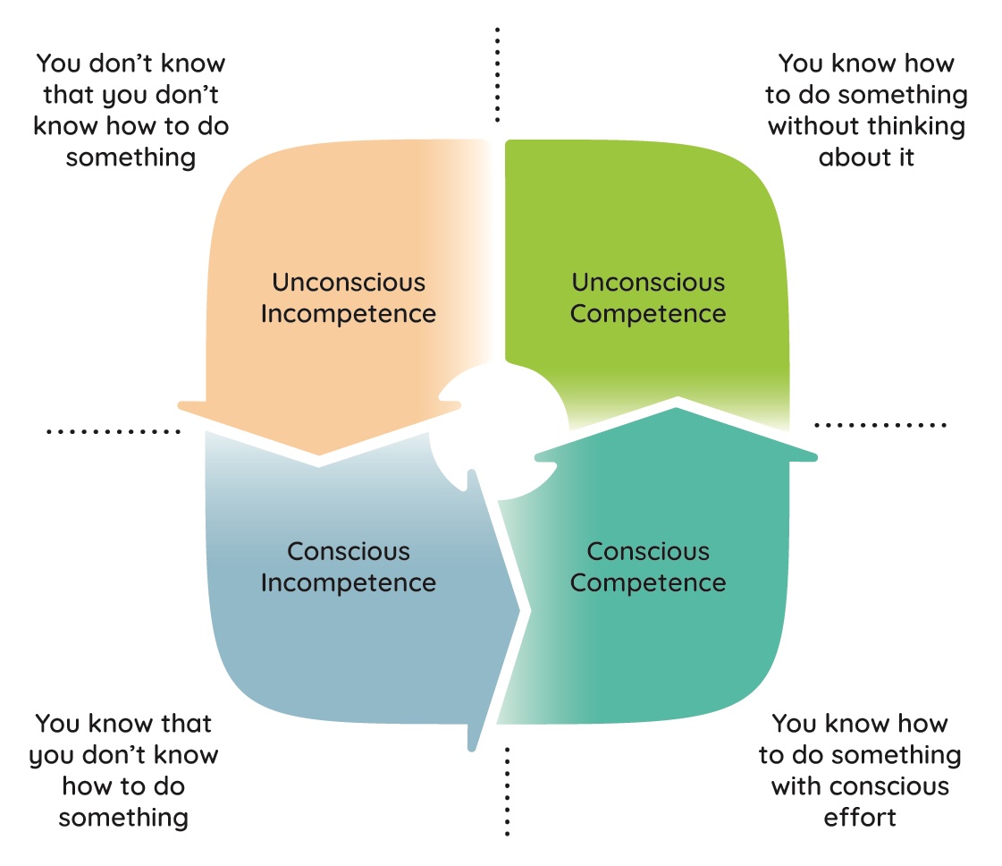 To whet your appetite – here is a key figure from the book, explaining the ‘evolution of expertise’ from unconscious incompetence – where you don’t know that you don’t know how to do something, to the ideal; unconscious competence, where you know how to do something without even thinking about it.